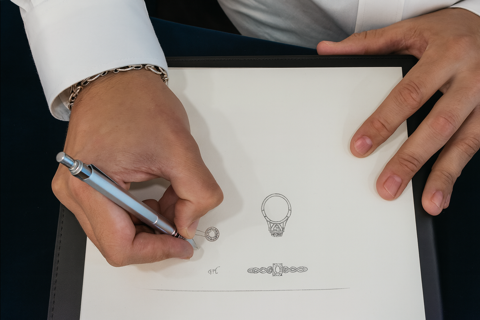 Our custom design journey begins with your vision, brought to life through a hand-drawn concept sketch created right before your eyes. In real time and to scale, our designers translate your ideas into an original sketch, allowing you to see your dream piece take shape from the very first moment.
